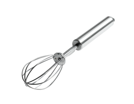 Close-up shot of a stainless steel whisk with a white handle, isolated