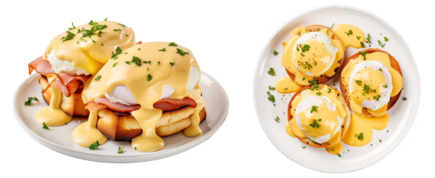 Eggs Benedict with hollandaise sauce isolated on transparent background, food bundle