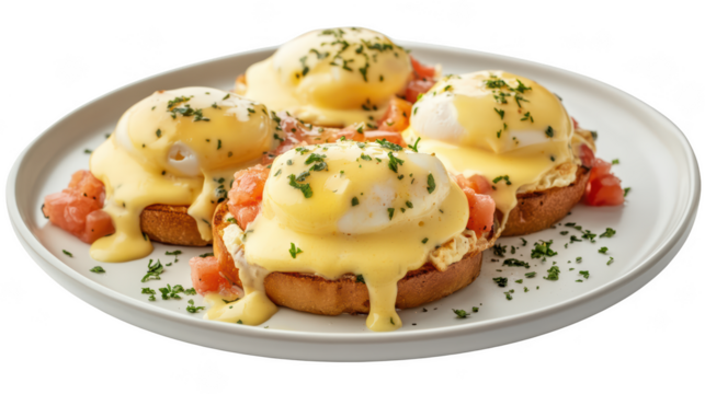 Isolated Plate of Eggs Benedict: A plate of eggs Benedict isolated on a transparent background, featuring poached eggs, Canadian bacon, English muffins, and hollandaise sauce, perfect for brunch menus
