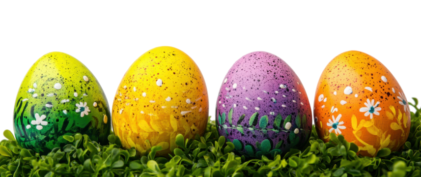 Colorful shiny easter eggs on grass with transparent background