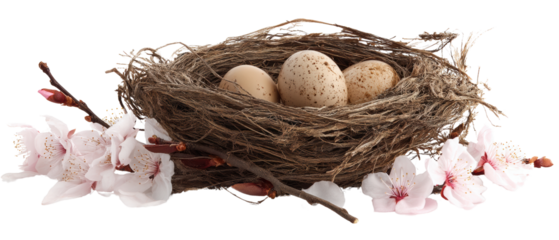 Charming spring scene featuring a bird with eggs on a floral branch, symbolizing renewal