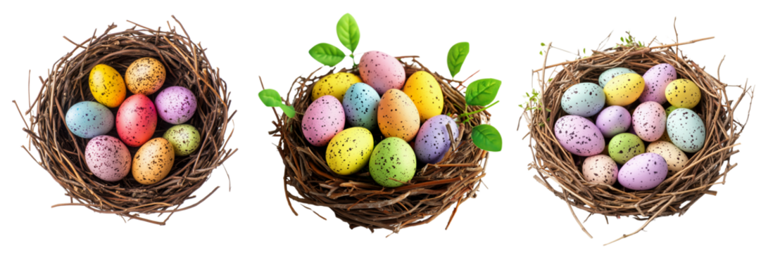 Decorative birds nest with colorful pink blue and yellow Easter eggs isolated on white background