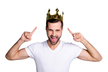 Portrait of funny funky lovely cheerful excited people person have gemstone ego crown feel rejoice attractive enjoy party laughter dressed light-colored outfit isolated grey background