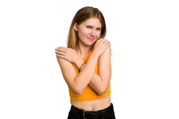 Young cute caucasian woman isolated hugs, smiling carefree and happy.