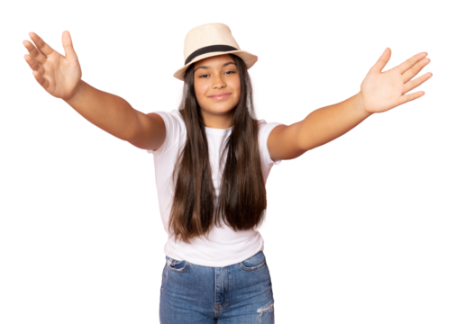 Young beautiful girl wearing straw hat standing isolated over transparent background feels confident giving a hug to the camera.