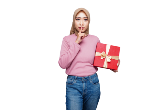 Hijab muslim woman with gift box isolated transparent