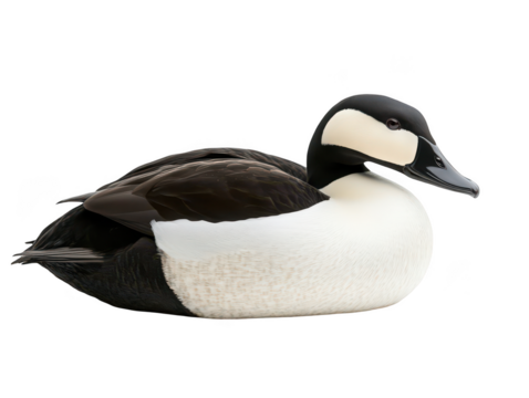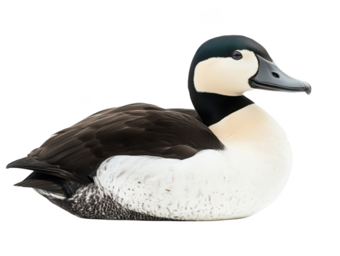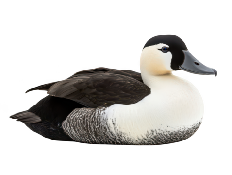 Close-up of a male eider duck with striking black and white plumage resting on a white background.