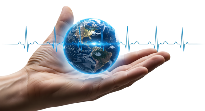 Close up of a human hand cradling a glowing earth with a blue ekg heartbeat line superimposed, symbolizing global health