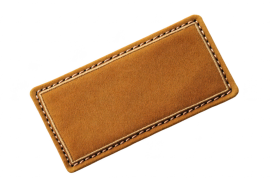 Brown fabric label with detailed stitching design for clothing or accessories isolated on a transparent background