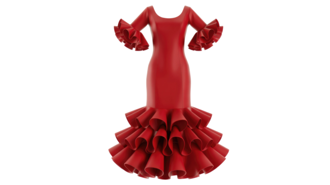 A vibrant red flamenco dress, featuring ruffled bell sleeves and an elaborate tiered ruffle skirt. Elegant and stylish, perfect for dance or special occasions. background removed