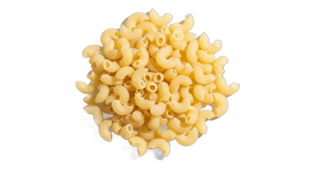 A circular pile of uncooked elbow macaroni pasta isolated on a white background. PNG Transparent