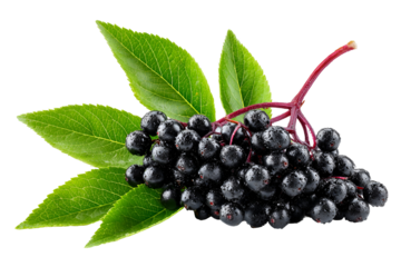 Fresh elderberry cluster with green leaves isolated on transparent background