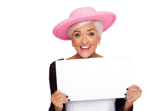 Advertising, palm isolated senior woman and against a transparent png background for promotion. Marketing or branding, smile or excited and happy or cheerful elderly female person for advertisement