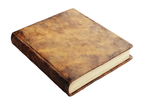 transparent background Closed vintage brown leather-bound book with worn cover and aged pages. Antique and historical themes.