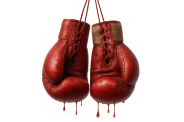 Pair of aged red boxing gloves dripping blood, symbolizing defeat, intense sport, aggression, and retirement from fighting