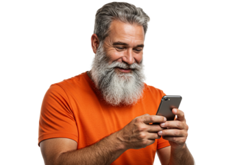 Senior Man with White Beard in Orange Shirt Smiling Joyfully While Using Smartphone, png, without background