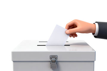 A hand wearing a red sleeve carefully places a white ballot into a bright red voting box isolated on transparent background