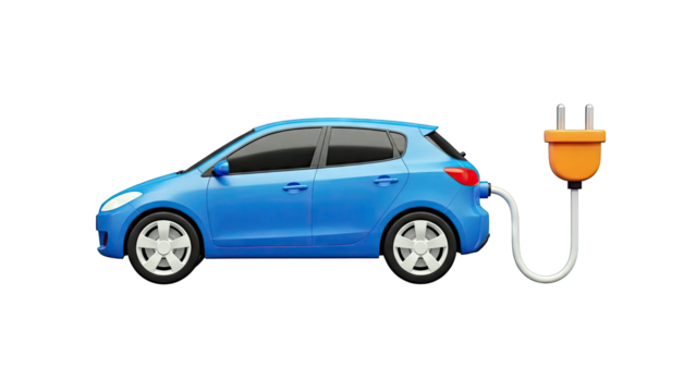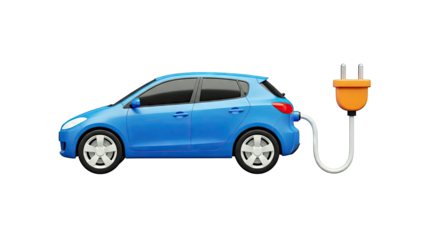 Sleek silver electric car charging at station isolated on white. PNG transparent.
