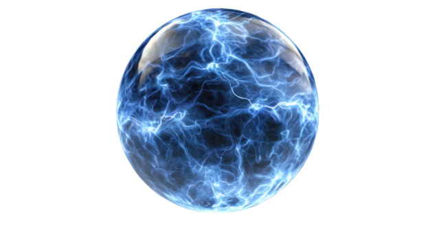 Glowing blue energy sphere pulsing with electric currents, radiating dynamic power against transparent backdrop