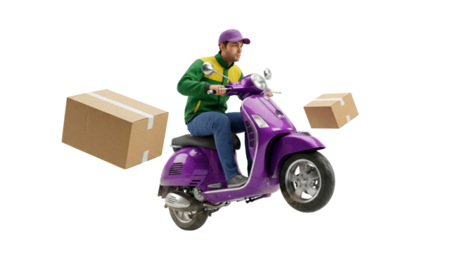 Person riding a purple scooter midair with floating cardboard boxes on isolated transparent
