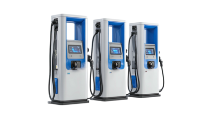 Row of modern electric vehicle charging stations with digital displays and charging cables, electric car infrastructure, clean energy solution