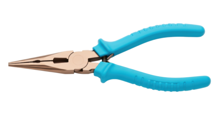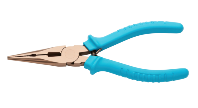 Isolated needle-nose pliers with blue handles lie on their side for precise electrical work