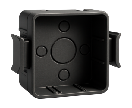 Compact electrical junction box for installation behind light switches in an apartment, with side clamps for secure fixation.