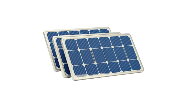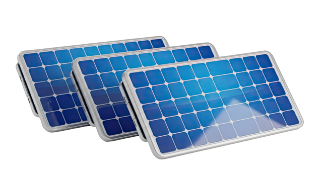 Array of five solar panels installed outdoors on a sunny day, renewable energy technology for sustainable power generation isolated on transparent background