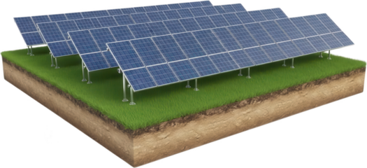 Array of blue photovoltaic solar panels arranged on lush green grass covering a cross section of soil layers renewable energy solar energy green energy sustainable energy transparent background