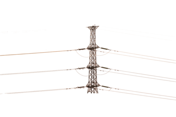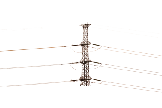 Photo of high voltage power tower, electriciy pylon and electric line cables isolated on white or transparent background, png cut out