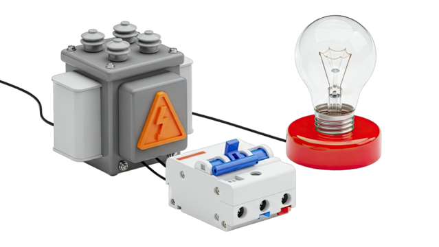 Electrical Circuit Components: Transformer, Breaker, and Light Bulb