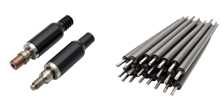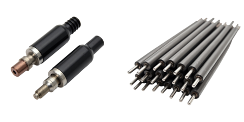 Welding electrodes isolated on a transparent background featuring two different types of electrodes alongside a group of multiple welding rods arranged neatly