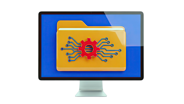 Computer monitor displaying digital folder with circuit board icon