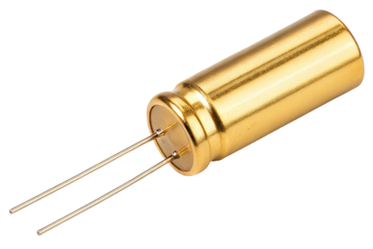 Transistor electronic component with metallic pins, isolated on transparent background, displaying intricate technical details for circuit design