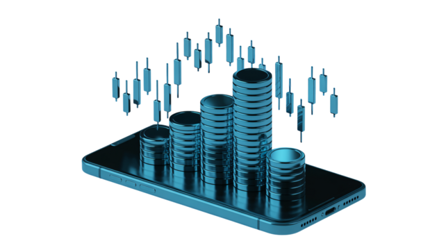 Digital finance growth concept featuring glowing blue coin stacks rising from a smartphone screen