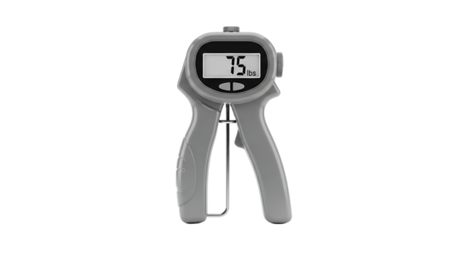 Digital Hand Dynamometer Displays 75 Percent on Screen in Light Gray Isolated on White Background Represents Grip Strength and Exercise Equipment