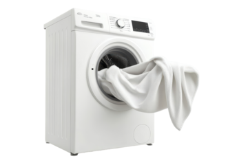 White washing machine with laundry tumbling out isolated on transparent background. Modern white washing machine a sleek and efficient white washing machine isolated on white background.