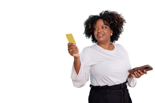 Happy adult woman holding a credit card and smartphone, engaging in online shopping and digital banking, with a transparent background