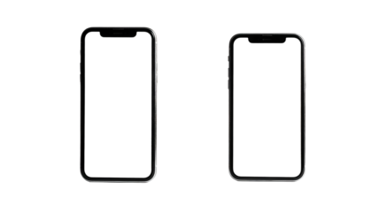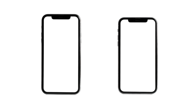 Two rectangular handheld devices are positioned side-by-side, each with a dark, featureless screen against a black background