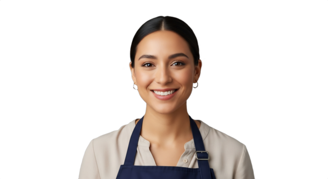 Smiling 25-29-year-old Hispanic woman, a calligrapher creating elegant New Year's invitations, wearing an artistic smock. Ideal for holiday promotions, creative services, and event design.