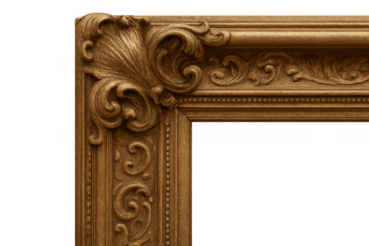 Ornate antique carved wooden frame corner with baroque pattern and elaborate rococo decoration, transparent background