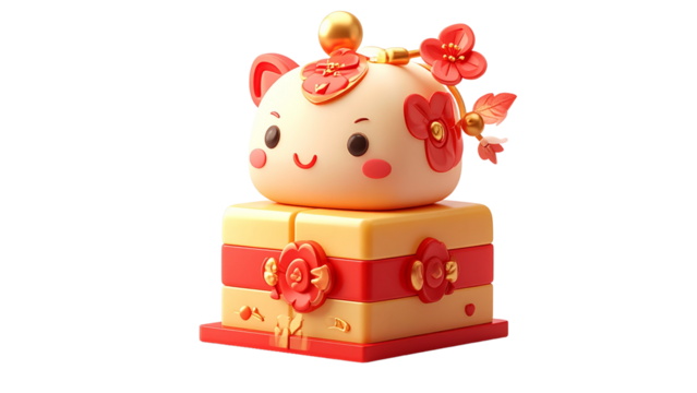 Cute cartoon animal character in red and gold outfit, adorned with floral accents and a decorative top, on a square base
