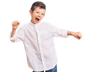 Cute blond kid wearing elegant shirt dancing happy and cheerful, smiling moving casual and confident listening to music