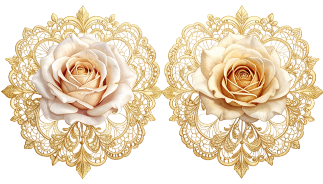 Two elegant roses sit in ornate golden lace frames against a black backdrop