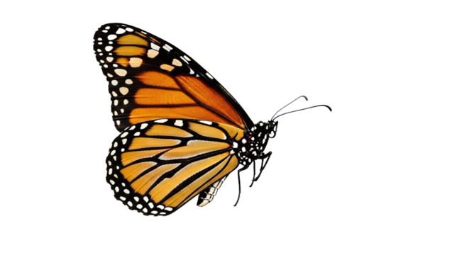 Monarch butterfly with orange, black, and white wings in side view, delicate insect isolated on transparent background