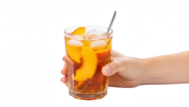 Hand holding a tall glass of iced tea with peach slices and a straw isolated on transparent background