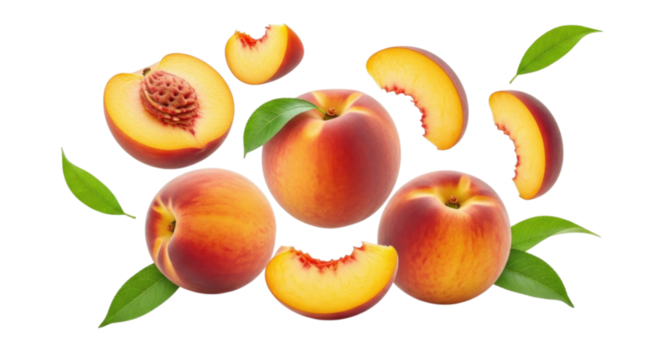 Whole and half peach fruit with green leaf isolated on transparent background, juicy fresh summer fruit for healthy nutrition, vegan menu, and food design