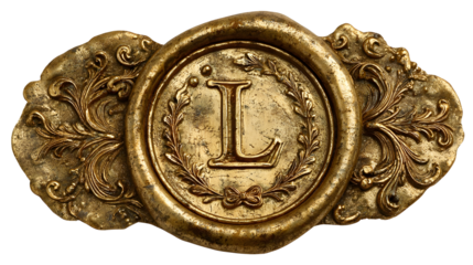 Ornate golden wax seal with embossed letter l for elegant stationery design