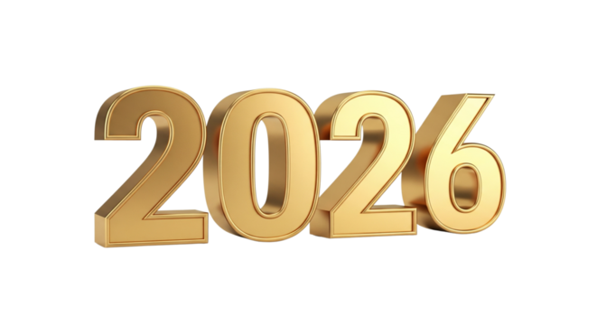Elegant 3D golden numbers for the year 2026. A luxurious, metallic text isolated on a white background. Perfect for Happy New Year greetings and celebrations.