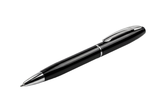A sleek black ballpoint pen with silver accents, transparent background